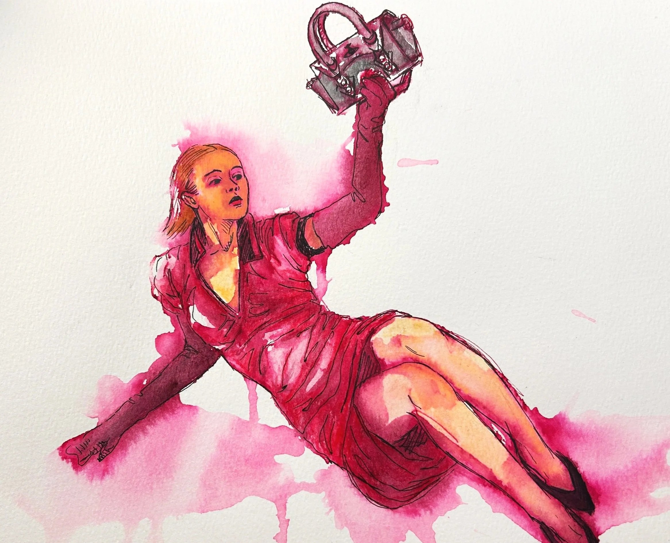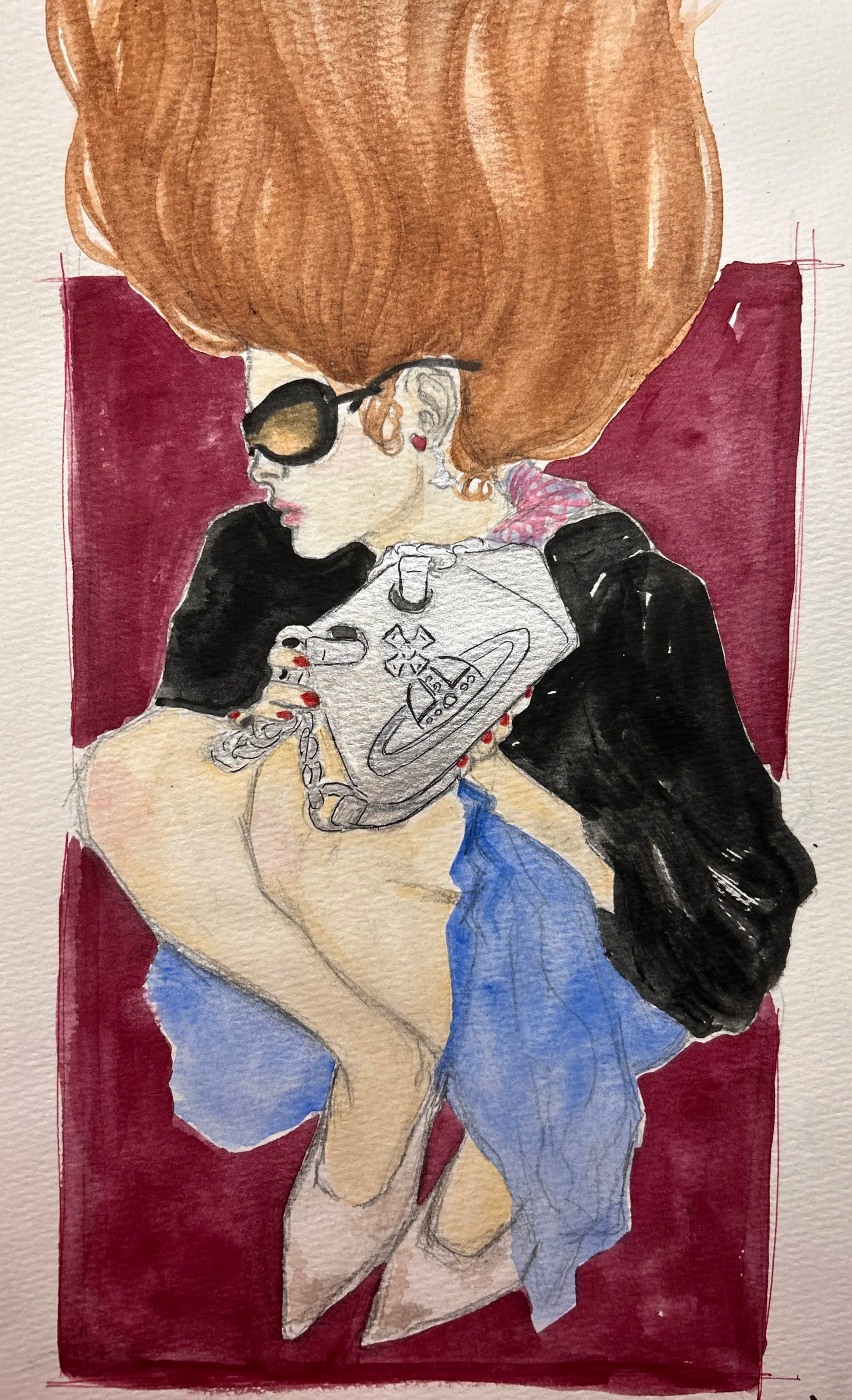 This personal project was inspired from the Vivienne Westwood, Spring-Summer 2026 LookBook, Look 2. This look was one of my favorites from the LookBook itself, when I saw it I felt motivated to recreate it in a hand-drawn illustration with a messy watercolor and high-energy composition. From the bold red dress to the fabulous bag, I wanted to give it a whimsical and imperfect aesthetic that, in my opinion, fits the Westwood style. I typically start my illustrations with a light sketch or water activated pen, afterwards when I’m satisfied with the piece, I’ll use watercolor to add elements of color and movement to make it personal and interesting.