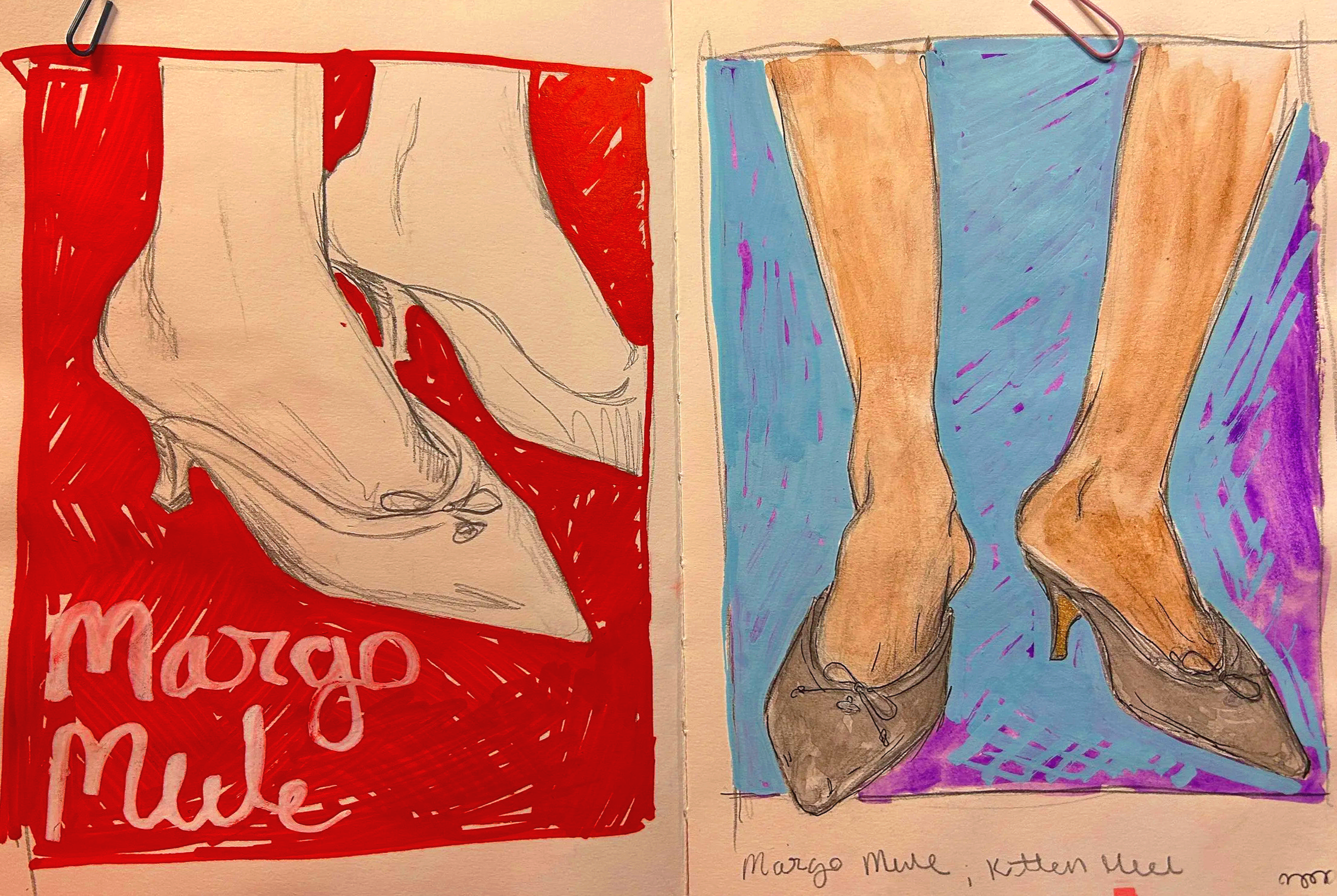 A spread from my sketchbook showing the Margo Mule Kitten Heels